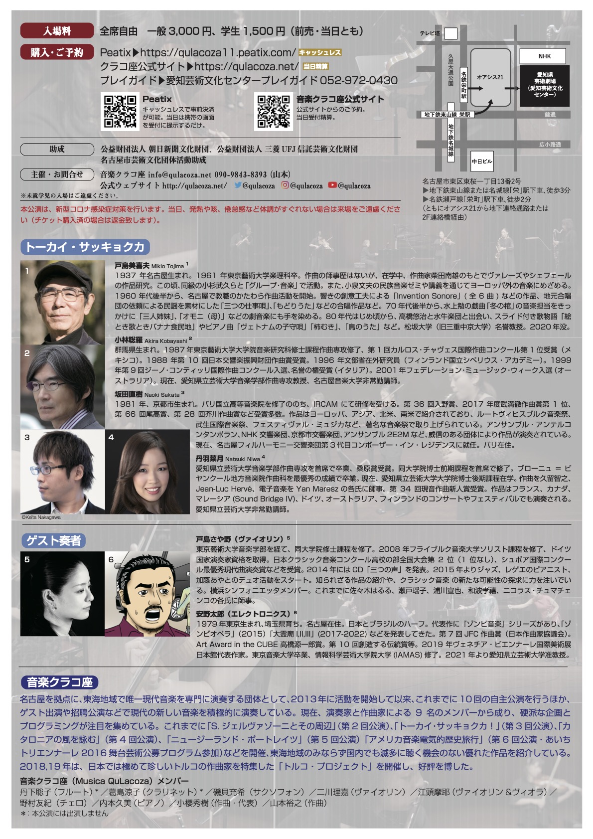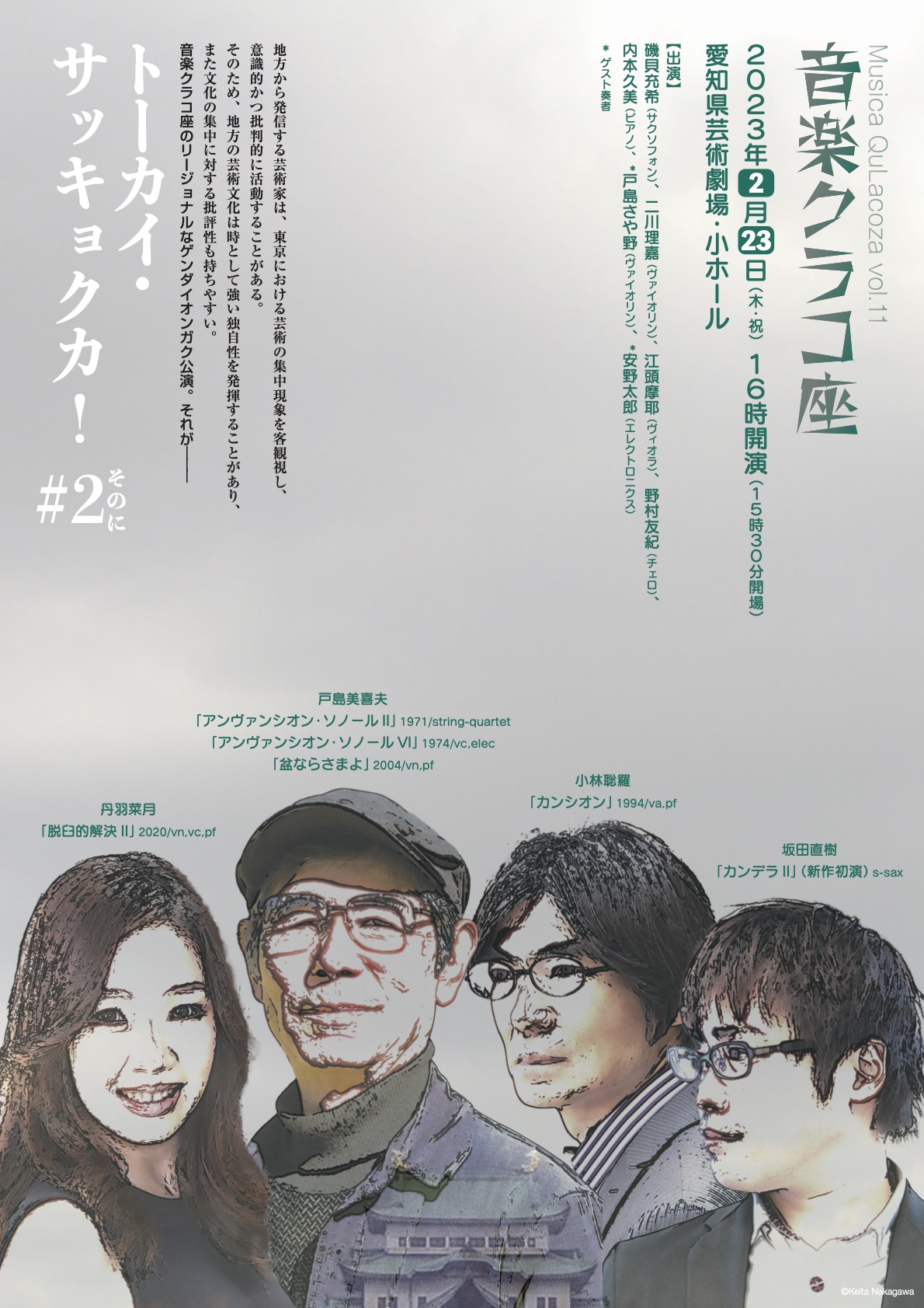 プログラムは2020年に亡くなった名古屋の作曲家、戸島美喜夫氏の作品を中心に据える。戸島氏は、かつて一世を風靡した即興演奏集団「グループ音楽」(東京)に所属し集団音楽パフォーマンス等を行っていたが、その後地元名古屋に戻り、「オブジェ・ソノール」という概念に基づいた音響実験的な性格を持つ作品群や、日本各地の民謡を元にした多くの作品を書くようになった。本公演では戸島氏の作品をご遺族の協力を得ながら調査し、民謡的、音響実験的な作品を演奏、若い頃を除いてほぼ愛知県を拠点に活動を続けた戸島氏の素顔に迫る。また現役の作曲家からは、芥川作曲賞や尾高賞などを受賞し、現在名古屋フィルのレジデンス・コンポーザーを務める坂田直樹氏の新作初演作品、また近年積極的な活動を展開する丹羽菜月氏、愛知県立芸術大学教授で叙情的な作品を多く手がける小林聡羅氏の珠玉の作品を取り上げる。